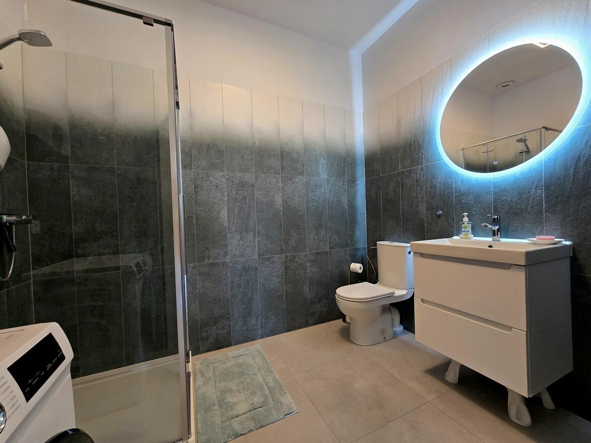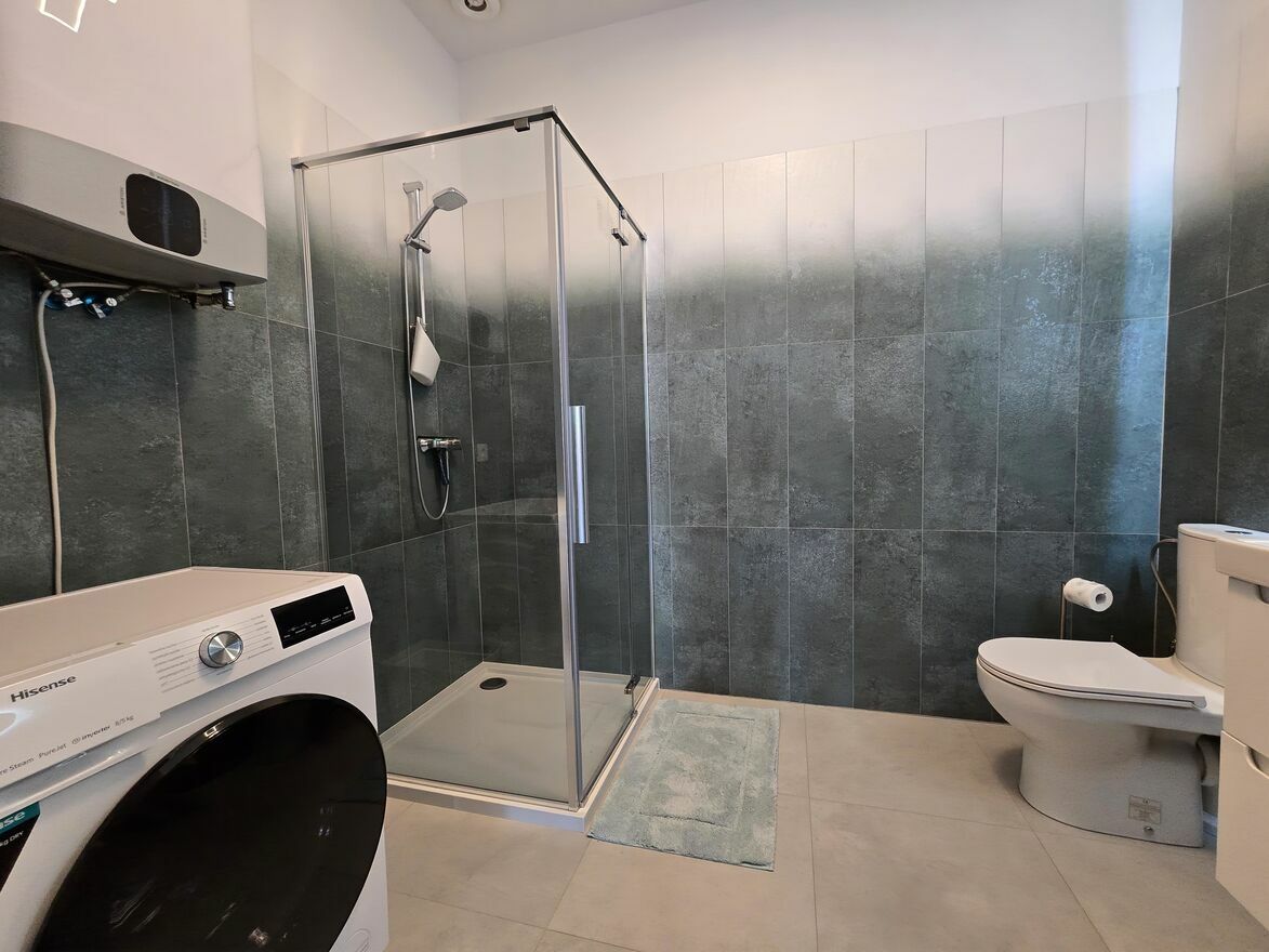 W łazience kabina prysznicowa, umywalka, pralka, bojler elektryczny; ogrzewanie podłogowe.
